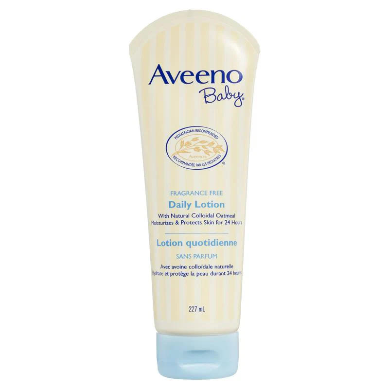 AVEENO® Baby Daily Lotion contains natural colloidal oatmeal blended with rich emollients that soothe and help protect your baby's delicate skin. The naturally nourishing, non-greasy formula absorbs quickly, moisturizes for a full 24 hours, contains no drying alcohols and won't clog pores. It’s formulated to be hypoallergenic, fragrance-free and gentle enough for daily use on baby's sensitive skin.